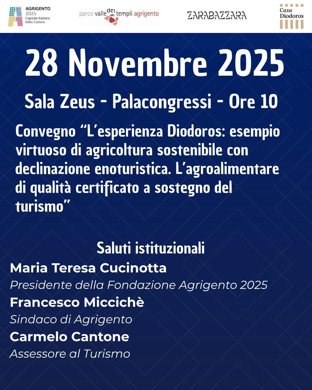 Il primo appuntamento è venerdì 28 novembre alle 10 alla sala Zeus del Palacongressi di Agrigento con l’apertura ufficiale della due giorni che sarà affidata al convegno “L’esperienza Diodoros: esempio virtuoso di agricoltura sostenibile con declinazione enoturistica. L’agroalimentare di qualità certificato a sostegno del turismo”.