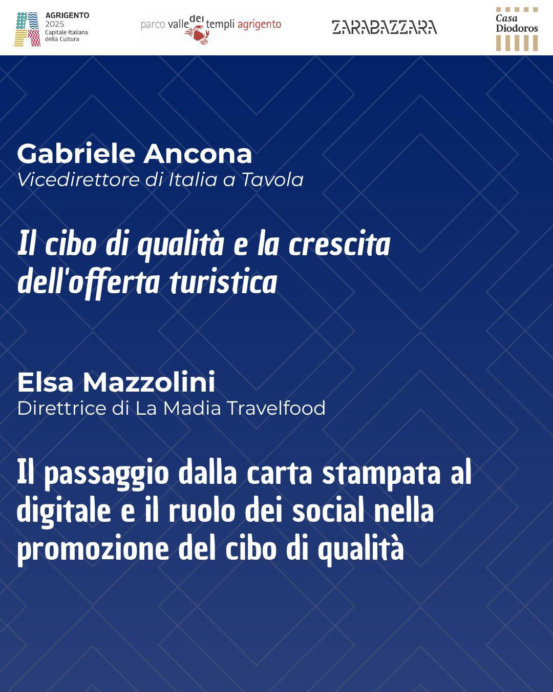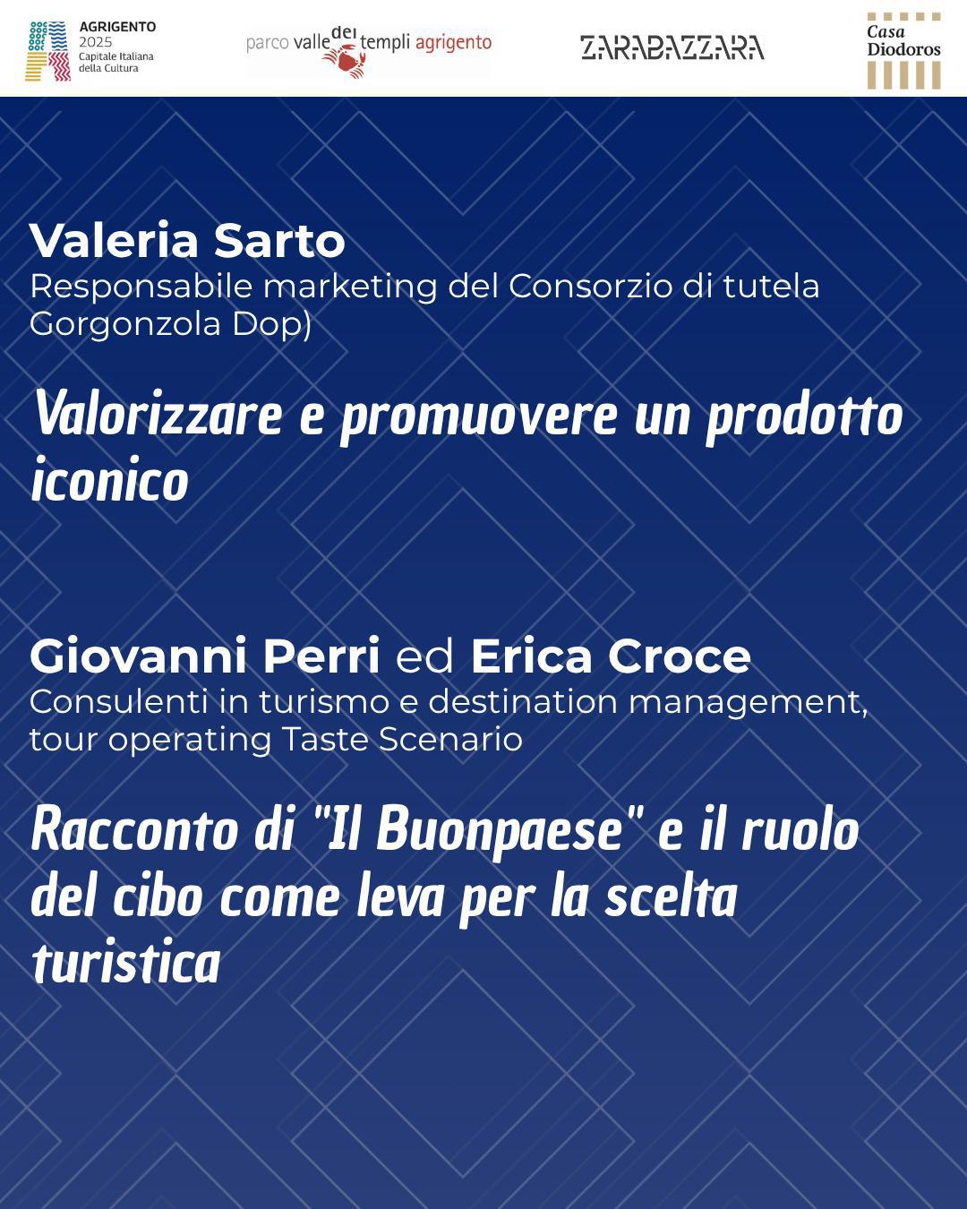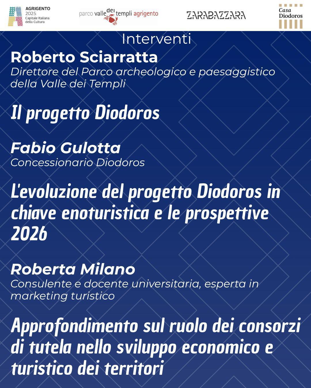Dopo i saluti istituzionali della presidente della Fondazione Maria Teresa Cucinotta, del sindaco Francesco Miccichè e dell’assessore al Turismo Carmelo Cantone, interverranno Roberto Sciarratta, direttore del Parco Archeologico e Paesaggistico della Valle dei Templi, che illustrerà il progetto Diodoros; Fabio Gulotta, concessionario Diodoros, che presenterà l’evoluzione del progetto in chiave enoturistica e le nuove prospettive per il 2026; Roberta Milano, consulente e docente universitaria, esperta in marketing turistico, che approfondirà il ruolo dei consorzi di tutela nello sviluppo economico e turistico dei territori; Valeria Sarto, responsabile marketing del Consorzio di tutela Gorgonzola Dop, che parlerà di valorizzazione e promozione di un prodotto iconico; Giovanni Perri ed Erica Croce consulenti in turismo e destination management, tour operating  Taste Scenario, che racconteranno “Il Buonpaese” e il ruolo del cibo come leva per la scelta turistica; Gabriele Ancona, vicedirettore di Italia a Tavola, che discuterà del cibo di qualità e della crescita dell’offerta turistica ed Elsa Mazzolini, direttrice di La Madia Travelfood, che affronterà il tema del passaggio dalla carta stampata al digitale e del ruolo dei social nella promozione del cibo di qualità. L’evento è ad accesso libero.