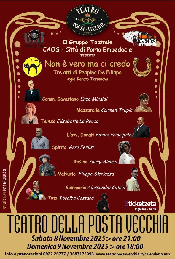 Carissimi amici vicini e lontani (avrebbe esordito il grande Filogamo), amanti del teatro, non perdete questa irripetibile occasione. Nel gioiellino di Giovanni Moscato, la Posta Vecchia, il Gruppo CAOS, sarà in scena sabato 8 sera alle ore 21,00 ed in replica pomeridiana domenica 9 alle ore 18,00 con il classico capolavoro di Peppino de Filippo: Non è vero, ma ci credo. Per chi se lo fosse perso quest'estate e/o per chi volesse rivederlo in un ambiente chiuso e più adatto ad un'opera teatrale, vi aspettiamo.