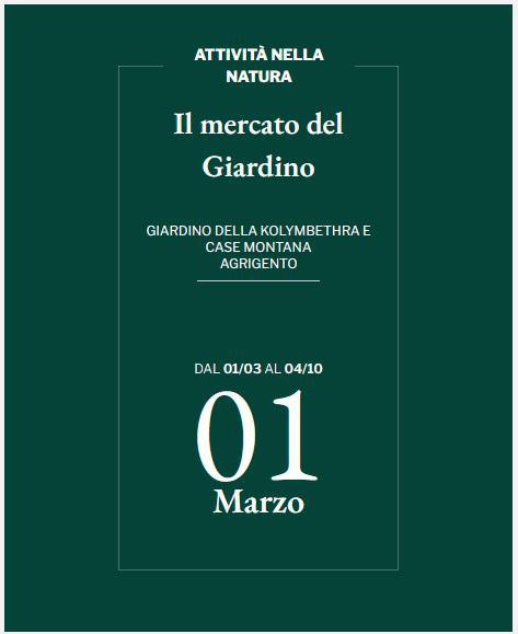 Nel cuore della Valle dei Templi di Agrigento, il Giardino della Kolymbethra ospita un mercato agricolo e florovivaistico, in programma nei mesi di marzo e ottobre, periodi ideali per vivere il giardino nei suoi momenti più suggestivi. Un’occasione speciale per passeggiare lungo i sentieri del giardino, tra agrumeti storici, ulivi secolari, mandorli, fichi d’India e piante aromatiche, scoprendo lungo il percorso una selezione accurata di prodotti e primizie tipiche di questo paesaggio antico. Il mercato, che prende forma in questo luogo per ricordare e valorizzare la vocazione agricola storica della Kolymbethra, non è solo uno spazio di acquisto, ma la testimonianza concreta di una cultura agricola profondamente radicata nel luogo e un racconto vivo del territorio: fiori, piante e prodotti proposti provengono infatti da coltivazioni locali e seguono il ritmo naturale delle stagioni.