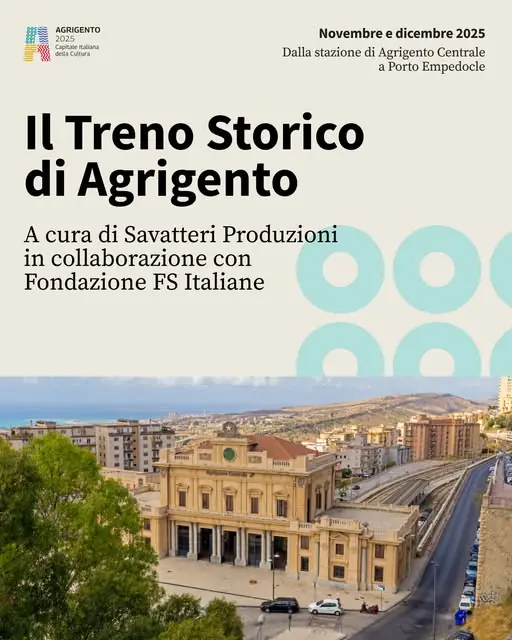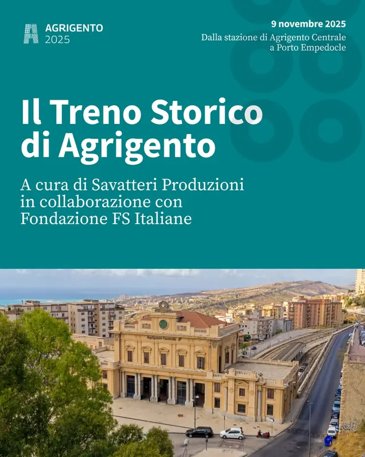 🚂 Il viaggio continua sulla Ferrovia dei Templi. Domenica 16 novembre torna Il Treno Storico di Agrigento, la performance immersiva ideata da Savatteri Produzioni in collaborazione con Fondazione FS Italiane, nell’ambito di Agrigento Capitale Italiana della Cultura 2025. A bordo delle carrozze d’epo